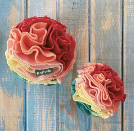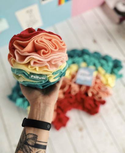 Kula węchowa to trudniejsza wersja maty. Smakołyki można schować głębiej, zajmuje więcej czasu, wymaga od pupila aktywności – kula się obraca, ucieka, trzeba ją przytrzymać, bardziej aktywizuje.