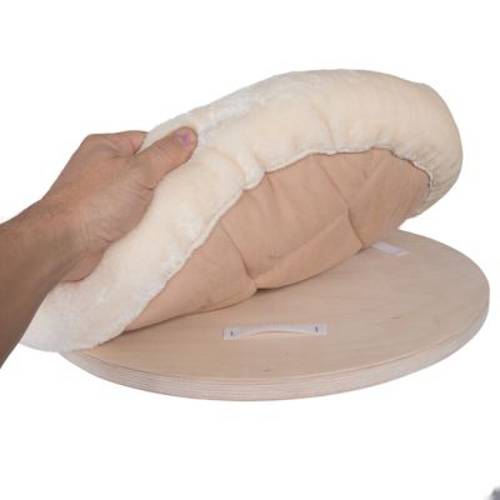 Okrągłe legowisko do przymocowania do ściany, z naturalnego drewna z przymocowaną poduszką z zapięciami na rzepy. Można prać w pralce w temp do 30°C, łatwy montaż