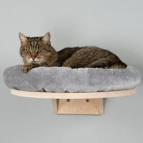 Okrągłe legowisko do przymocowania do ściany, z naturalnego drewna z przymocowaną poduszką z zapięciami na rzepy. Można prać w pralce w temp do 30°C, łatwy montaż