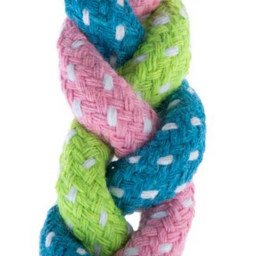 Kolorowa zabawka dla psa, w kształcie kości, idealna do gryzienia i aportowania, pleciony sznurek o bawełnianej teksturze, węzły na końcach, łatwa do chwytania, lekka, z bawełny i poliestru