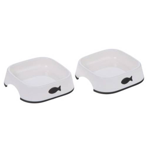 Zestaw 2 plastikowych misek z rybim motywem, antypoślizgowy spód, dwa uchwyty po bokach dla łatwiejszego podnoszenia, bardzo płytkie i szerokie, można myć w zmywarce, kolor: białyTo zasmakuje Twojemu kotu: urocze miski Little Fish możesz zakupić w korzystnym zestawie! Dwa małe, rybie motywy zapewni…