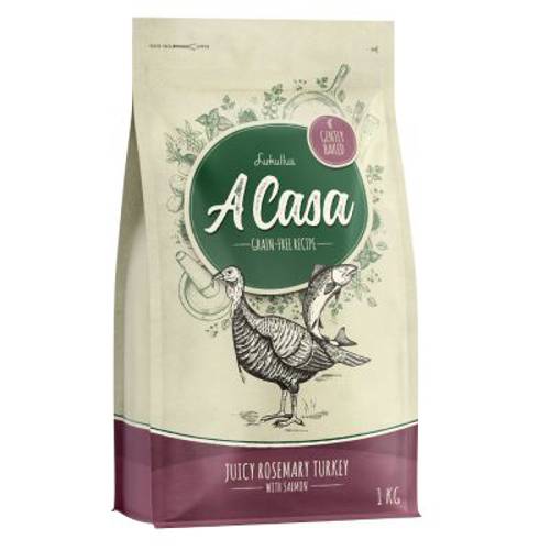 arma Lukullus A Casa Juicy Rosemary Turkey (soczysty indyk z rozmarynem) zawiera soczyste, świeże mięso z indyka oraz delikatnego łososia, doprawione lokalnymi składnikami superfoods: czerwonym burakiem, porzeczką i aronią. Receptura została udoskonalona olejem z orzecha włoskiego, olejem z łososia oraz olejem z ogórecznika lekarskiego stanowiącymi naturalne źródła kwasów tłuszczowych omega-3 i omega-6. Bezzbożowe krokiety zostały powoli i delikatnie wypieczone, przez co zachowały pierwotne składniki odżywcze i smak. Naturalne i urozmaicone receptury dostarczają do organizmu Twojego psa wszystkie niezbędne składniki pokarmowe. Wypiekana i chrupka, pachnąca rozmarynem, z widocznymi kawałeczkami siemienia lnianego i ziół karma Lukullus A Casa jest starannie przyrządzona niczym w domowym zaciszu.