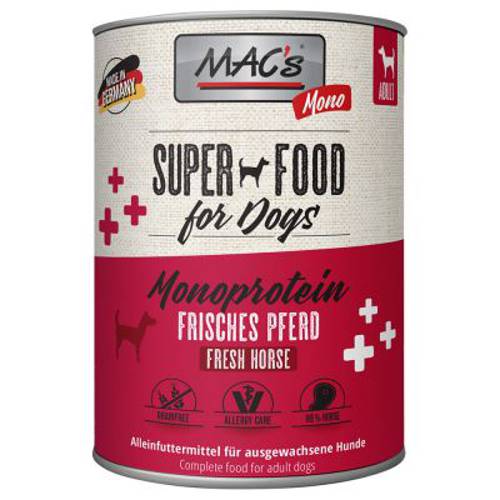 MAC's Mono Sensitive jest szczególnie dobrze tolerowaną mokrą karmą, stworzoną do żywienia dorosłych psów ze skłonnością do alergii pokarmowych. Smakowita karma składa się z dużej ilości mięsa tylko jednego rodzaju. Jest to jedyne źródło białka zwierzęcego, dlatego MAC Mono Sensitive doskonale nadaje się dla diet eliminacyjnych.Mokra karma MAC nie zawiera soi ani zbóż, co dodatkowo przyczynia się do dobrej strawności. W produkcji unika się również stosowania mączki zwierzęcej i kostnej. Produkcja odbywa się w Niemczech.