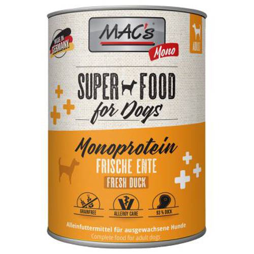 MAC's Mono Sensitive jest szczególnie dobrze tolerowaną mokrą karmą, stworzoną do żywienia dorosłych psów ze skłonnością do alergii pokarmowych. Smakowita karma składa się z dużej ilości mięsa tylko jednego rodzaju. Jest to jedyne źródło białka zwierzęcego, dlatego MAC Mono Sensitive doskonale nadaje się dla diet eliminacyjnych.Mokra karma MAC nie zawiera soi ani zbóż, co dodatkowo przyczynia się do dobrej strawności. W produkcji unika się również stosowania mączki zwierzęcej i kostnej. Produkcja odbywa się w Niemczech.