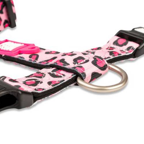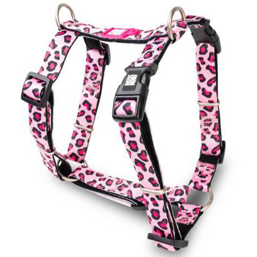 Regulowane szelki dla psa ze stylowym nadrukiem w różową panterkę, dwuwarstwowe i stabilne, idealne dla rosnących psów, wytrzymałe zapięcia, klamry D-ring na grzbiecie, wykonano z neoprenu i poliestru