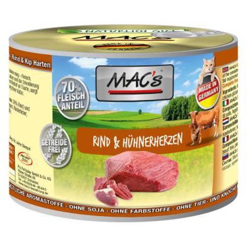 Karma mokra MAC´s Cat to wysokiej jakości pożywienia dla kota, która w szczególności nadaje się dla kotów o wrażliwym układzie pokarmowym. Przewód pokarmowy kota przyzwyczajony jest do diety opartej głównie na czystym mięsie. Karma zawierająca zboże często wywołuje nietolerancje pokarmowe u zwierząt. Z tego powodu, posiłki MAC's są całkowicie pozbawione zbóż i soi. Duża zawartość delikatnego mięsa (70%) zapewnia wyśmienity smak i wysoką akceptację. W karmie nie występują połączone kawałki mięsne, ani mączka kostna czy zwierzęca, jej wysoką jakość zapewnia najlepsze mięso z serc, wątroby czy płuc. Karma nie zawiera barwników, aromatów sztucznych i konserwantów. Dodatek tauryny przyczynia się do wzmocnienia funkcji serca i wzroku. Witaminy i minerały ponadto wzbogacają zrównoważoną dietę Twojego kota.