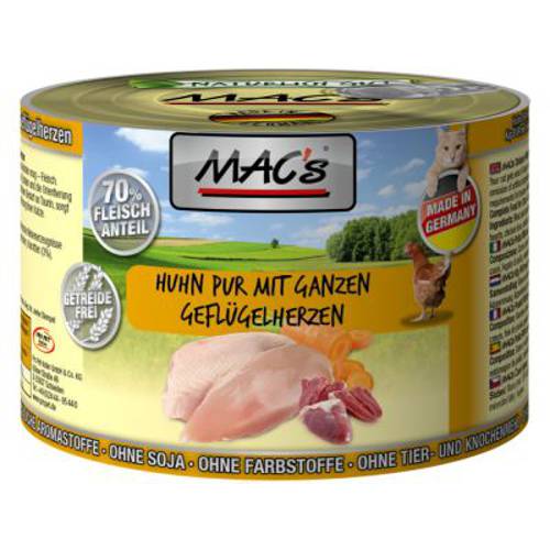 Karma mokra MAC´s Cat to wysokiej jakości pożywienia dla kota, która w szczególności nadaje się dla kotów o wrażliwym układzie pokarmowym. Przewód pokarmowy kota przyzwyczajony jest do diety opartej głównie na czystym mięsie. Karma zawierająca zboże często wywołuje nietolerancje pokarmowe u zwierząt. Z tego powodu, posiłki MAC's są całkowicie pozbawione zbóż i soi. Duża zawartość delikatnego mięsa (70%) zapewnia wyśmienity smak i wysoką akceptację. W karmie nie występują połączone kawałki mięsne, ani mączka kostna czy zwierzęca, jej wysoką jakość zapewnia najlepsze mięso z serc, wątroby czy płuc. Karma nie zawiera barwników, aromatów sztucznych i konserwantów. Dodatek tauryny przyczynia się do wzmocnienia funkcji serca i wzroku. Witaminy i minerały ponadto wzbogacają zrównoważoną dietę Twojego kota.