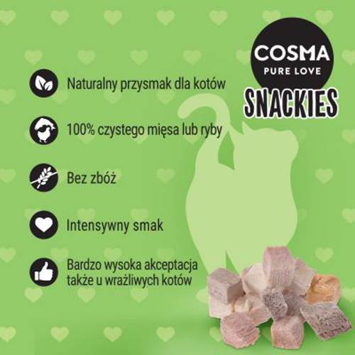 Suszone metodą mrożenia przysmaki Cosma Original Snackies XXL, składające się w 100% z mięsa albo ryby, są polecane przez lekarzy weterynarii oraz hodowców kotów, ponieważ są zdrowym smakołykiem, a dzięki naturalnemu smakowi cieszą się wyjątkowo wysoką akceptacją.