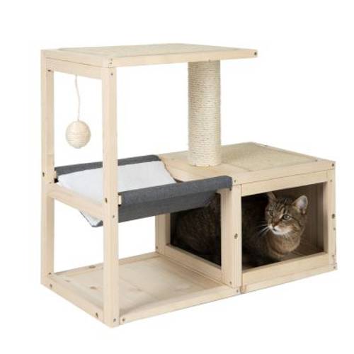 Domek do wspinania się i do zabawy dla kotów, solidna konstrukcja z drewna, duża platforma, 2 sizalowe maty i słupek do drapania, piłeczka do zabawy, duża jaskinia, hamak, kolor: naturalny / szary