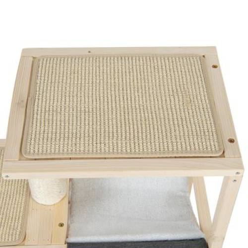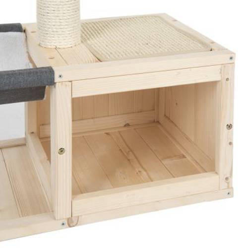 Domek do wspinania się i do zabawy dla kotów, solidna konstrukcja z drewna, duża platforma, 2 sizalowe maty i słupek do drapania, piłeczka do zabawy, duża jaskinia, hamak, kolor: naturalny / szary