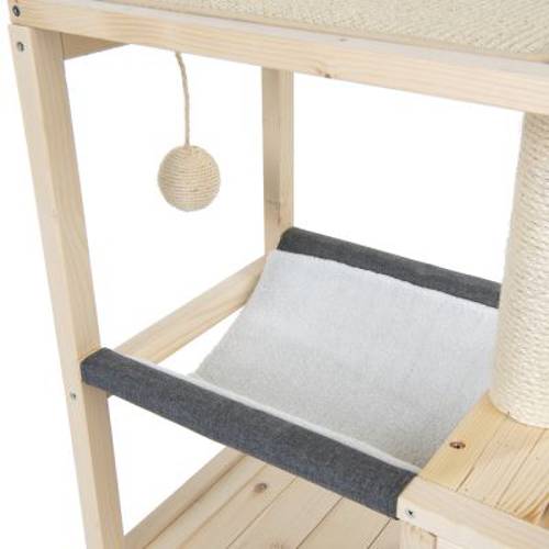 Domek do wspinania się i do zabawy dla kotów, solidna konstrukcja z drewna, duża platforma, 2 sizalowe maty i słupek do drapania, piłeczka do zabawy, duża jaskinia, hamak, kolor: naturalny / szary