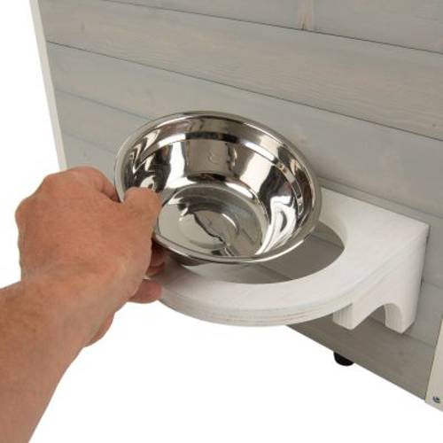 Dodatkowo przy budzie znajduje się odpowiednie miejsce do karmienia z wyjmowaną miską ze stali nierdzewnej, który zapewni higieniczne miejsce do karmienia.