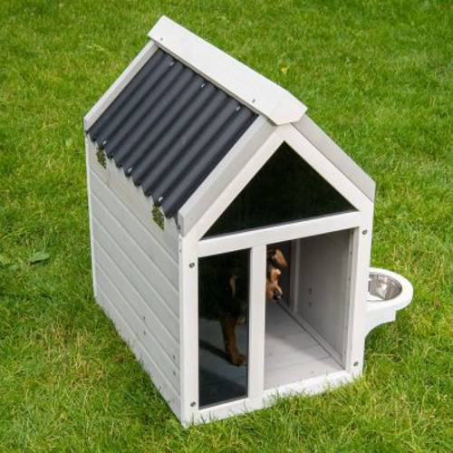 - Nowoczesny domek dla psa z dwuspadowym dachem i stylowym przeszklonym frontem.