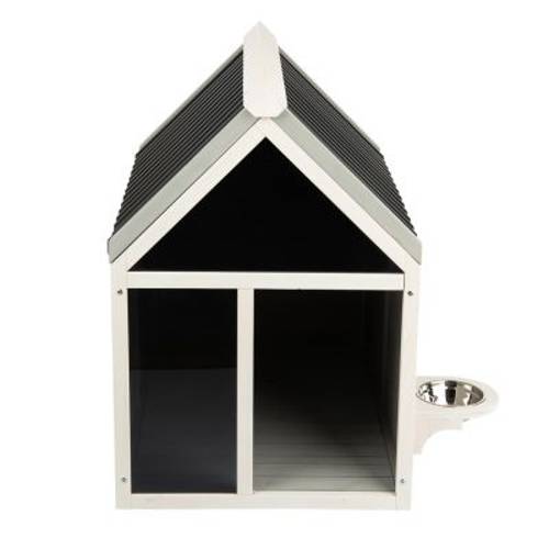 - Nowoczesny domek dla psa z dwuspadowym dachem i stylowym przeszklonym frontem.