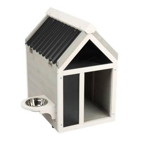Niezwykłą atrakcją nowoczesnej budy dla psa jest szklany front wykonany z przyciemnianych tafli PCV, który z jednej strony oszczędza czworonożnemu przyjacielowi ciemności, a jednocześnie chroni przed nadmiernym ciepłem i promieniowaniem UV. Dwuspadowy dach, pokryty w 100% wodoodpornymi arkuszami falistymi, jest odporny na wszelkie warunki pogodowe i gwarantuje suchość we wnętrzu. Ponieważ połowę dachu można otworzyć, czyszczenie jest szczególnie łatwe i umożliwia szybką wentylację wnętrza.