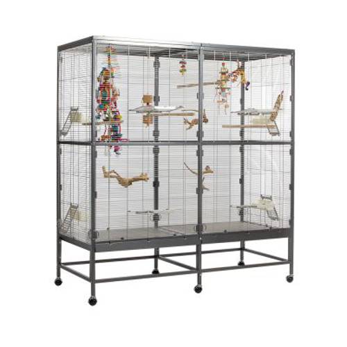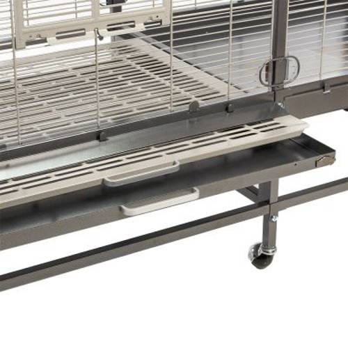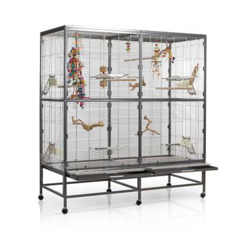 Sprytne dodatki, np. klapa ochronna przed szufladą i akrylowa osłona, zapewniają najwyższy poziom komfortu i ułatwiają czyszczenie. Czworo drzwi wejściowych można przekształcić w klapy do lądowania, a czworo drzwi bocznych – wykorzystać do przymocowania budki lęgowej lub basenu. Dzięki stabilnym, obrotowym o 360° kółkom wolierę można w razie potrzeby łatwo przestawić z jednego miejsca na drugie, a przy dobrej pogodzie wystawić na taras lub balkon.