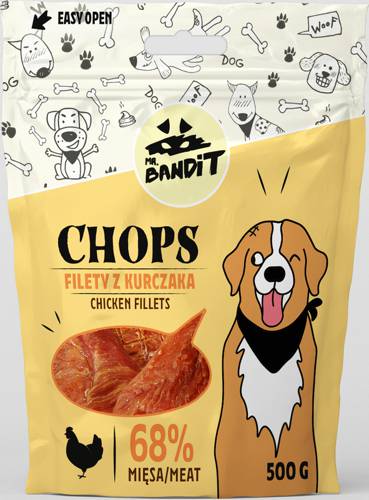 Mr. Bandit CHOPS filety z kurczaka to pyszna przekąska na bazie delikatnego mięsa z piersi kurczaka. Odpowiednio miękki oraz aromatyczny filet świetnie sprawdzi się jako regenerator sił podczas aktywności fizycznej lub upragniony smakołyk po spacerze.
