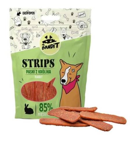 Mr. Bandit STRIPS paski z królika to supermiękka przekąska dla psich urwisów! Lekkostawne mięso z królika to idealne rozwiązanie dla wymagających łobuziaków. Pyszny i delikatny smakołyk, który kochają wszystkie psy.