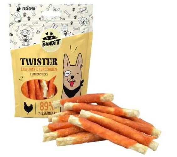 Mr. Bandit Twister zawijas z kurczaka to chrupiąca przekąska łącząca smakowitą wołowinę z delikatnym mięsem z piersi kurczaka. Smakołyk pomoże rozładować emocje, zapewni radość z gryzienia oraz pyszną przygodę!