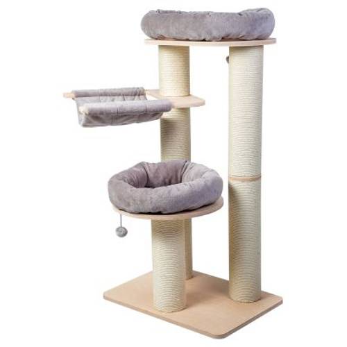 Stabilny drapak z grubymi sizalowymi słupkami, idealny dla kilku kotów, naturalne drewno, duże legowisko i hamak, zdejmowane poszewki można prać, obicie z certyfikatem Oeko-Tex®, wys.: 127,5 cm