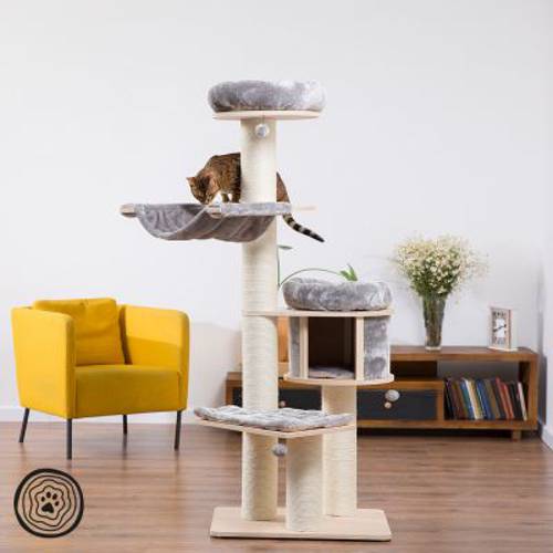 Duży drapak z platformami z prawdziwego drewna z ekologicznych szkółek leśnych, idealny dla dużych kotów, dużeściągane poduszki, które można prać. Wymiary, dł. x szer. x wys.: 105 x 90 x 175 cm