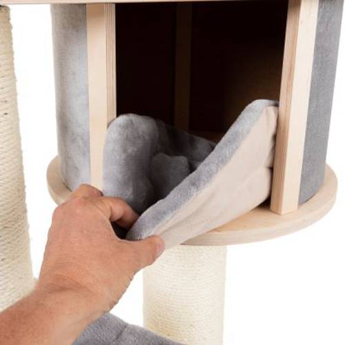 Prawdziwą atrakcją są wyjątkowo grube pnie sizalowe, które świetnie nadają się do wspinaczki, rozciągania i ostrzenia pazurów. A jeśli wszystkiego będzie dla Ciebie za dużo i chcesz mieć trochę ciszy i spokoju, możesz po prostu schować się w przytulnym domku.