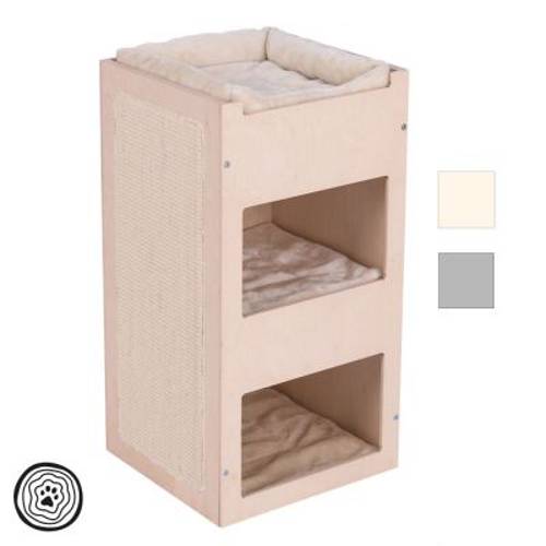 Co to jest? Może nowa szafa? Nie, wygląda bardziej jak fantazyjny drapak. Spójrz, są tutaj dwie budki, w których możesz się rozgościć. Poduszki wyglądają naprawdę wygodnie. I Twoi dwunożni przyjaciele mogą je dla Ciebie wyprać! Na samym szczycie drapaka znajduje się milutko wyściełana platforma widokowa. Stamtąd masz zawsze wszystko na widoku - idealnie!