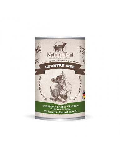 Karma mokra Natural Trail Country Side, to połączenie mięs z dzika, królika i jelenia z dodatkiem owoców i oleju z łososia.