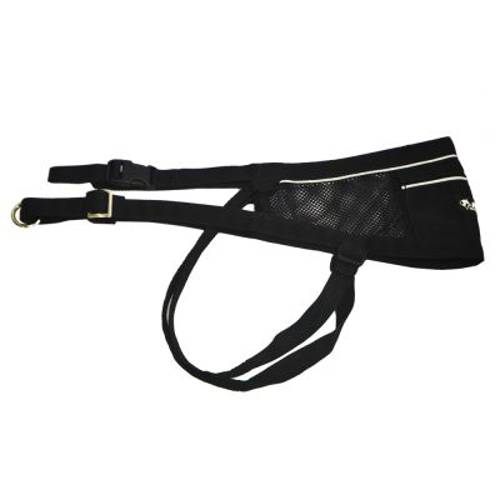 Pas z szelkami na nogi, doskonały do canicrossu czy joggingu z psem, smycz można przypiąć z przodu, regulacja rozmiaru, lekki i oddychający, z małą kieszenią i taśmą odblaskową, z polipropylenu