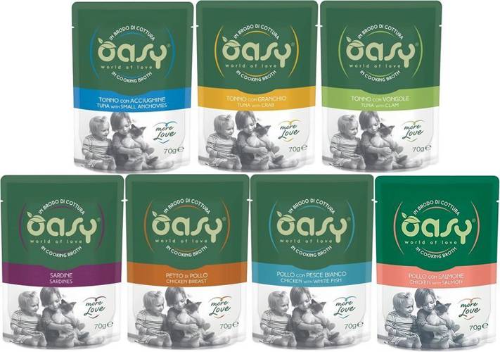 Saszetki o zawartości min. 65% mięsa lub ryb w pysznym bulionie. Przyrządzone z najlepszych i najświeższych składników o niezwykłym smaku i aromacie. Nie zawiera: sztucznych barwników aromatów konserwantów GMO soi i glutenu ZESTAW ZAWIERA: OASY More Love Wołowina 70G x2 OASY More Love Pierś z Kur…