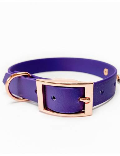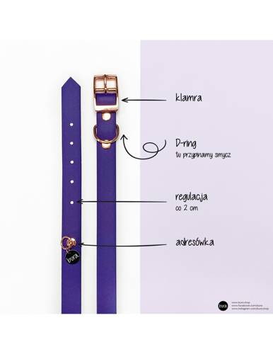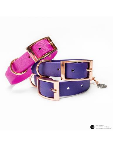 Obroża wykonana została z fioletowego Biothane®. Kolor fioletowy doda radości do codziennych spacerów. Do wykończenia obroży zostały użyte okucia w barwach różowozłotych. Obroża z Biothanu® jest trwała, nietoksyczna odporna na zabrudzenia. Łatwa w utrzymaniu w czystości, wystarczy przetrzeć mokrą ś…