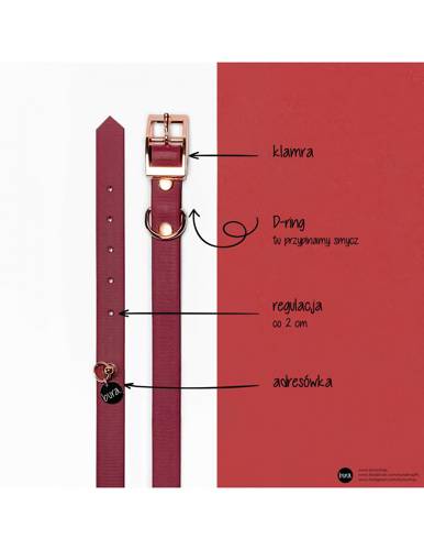 Obroża wykonana została z intensywnego bordowego Biothane®. Kolor dostojności i elegancji. Do wykończenia obroży zostały użyte okucia w barwach różowozłotych. Obroża z Biothanu® jest bardzo wytrzymała i odporna na warunki atmosferyczne. Łatwa w utrzymaniu w czystości, wystarczy przetrzeć mokrą ście…