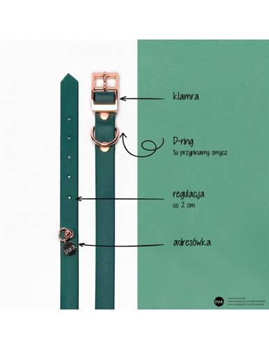 Obroża wykonana została z ciemnozielonego Biothanu®. Kolor, który podkreśli piękno i charakter Twojego pupila. Do wykończenia obroży zostały użyte okucia w barwach różowozłotych. Obroża z Biothanu® jest bardzo wytrzymała i odporna na warunki atmosferyczne. Łatwa w utrzymaniu w czystości, wystarczy przetrzeć mokrą ściereczką. W takiej obroży Twój pies będzie mógł swobodnie pływać, bawić się w błocie czy piasku.
