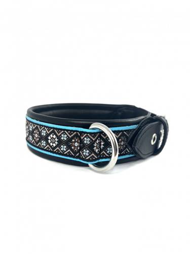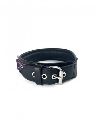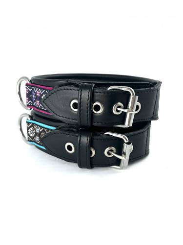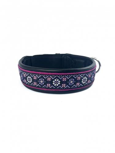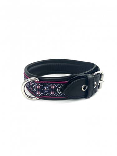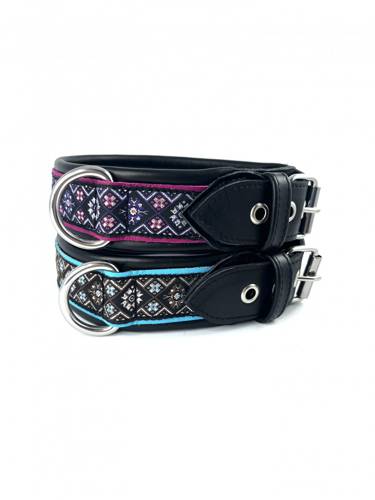 Obroża wykonana została z delikatnej i miękkiej skóry bydlęcej, dzięki czemu akcesoria nie wycierają sierści i nie powodują kołtunienia. Górna warstwa to ozdobna, najwyższej jakości taśma żakardowa.