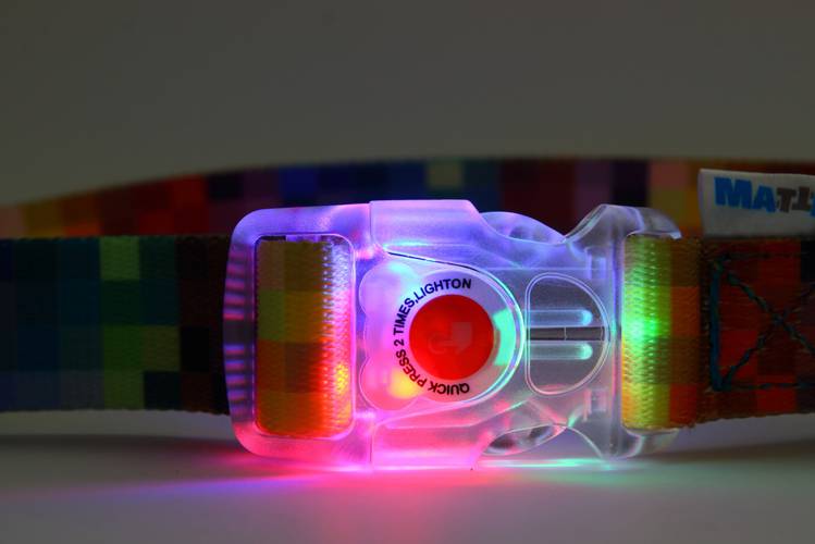 Wodoodporna obroża posiada unikatową klamrę ze źródłem światła LED w trzech kolorach i trzech trybach świecenia. W zestawie z baterią!