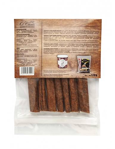 Przysmak O'Canis wykonanych ze 100% mięsa mięśniowego. Do przygotowania przekąski używane są tylko wybrane mięsa, uformowane w ciemne cygara a następnie poddane powolnemu i delikatnemu suszeniu.