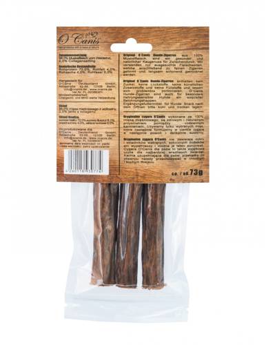 Przysmak O'Canis wykonane ze 100% mięsa mięśniowego. Do przygotowania przekąski używane są tylko wybrane mięsa, uformowane w ciemne cygara a następnie poddane powolnemu i delikatnemu suszeniu.