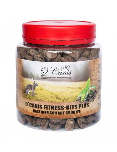 O'Canis Fitness Bits PLUS to bezzbożowy, pyszny przysmak dla psa. Bogaty w mięso zająca które jest lekkostrawne, bogate w aminokwasy i witaminy z dodatkiem zdrowej herbaty zielonej oraz warzyw zapewnia witalność i chęć do dalszego treningu.