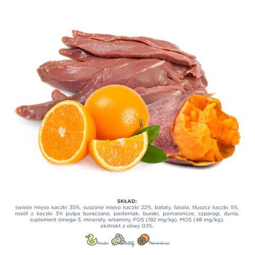 - Bataty, fasola, tłuszcz kaczki 5%, pulpa buraczana, pasternak, buraki, pomarańcze, szparagi, dynia, suplement omega-3, minerały, witaminy, FOS (192 mg/kg), MOS (48 mg/kg), ekstrakt z oliwy 0,1%.