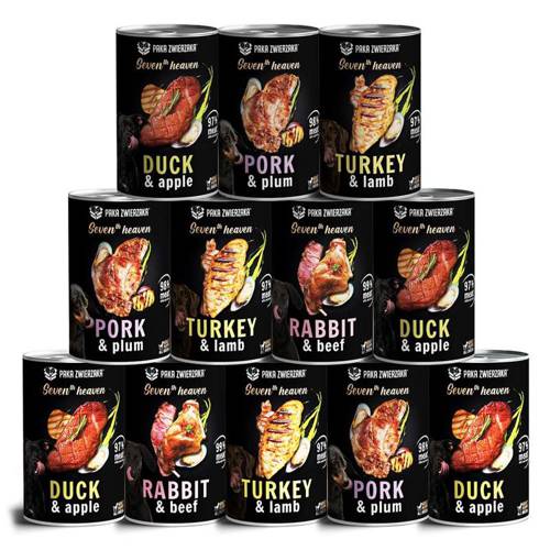 Paka Zwierzaka Seventh Heaven Mix Smaków 12x400g zawiera: 3x Paka Zwierzaka Seventh Heaven - kaczka z jabłkiem 400g 3x Paka Zwierzaka Seventh Heaven - schab ze śliwką 400g 3x Paka Zwierzaka Seventh Heaven - królik z wołowiną 400g 3x Paka Zwierzaka Seventh Heaven - indyk z jagnięciną 400g Idealnie…
