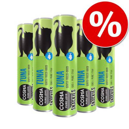 Zamrożone i wysuszone metodą liofilizacji przysmaki Cosma Snackies w 100 % z ryby albo mięsa. W praktycznej, ponownie zamykanej tubie Teraz 5 opakowań w korzystnym pakiecie!