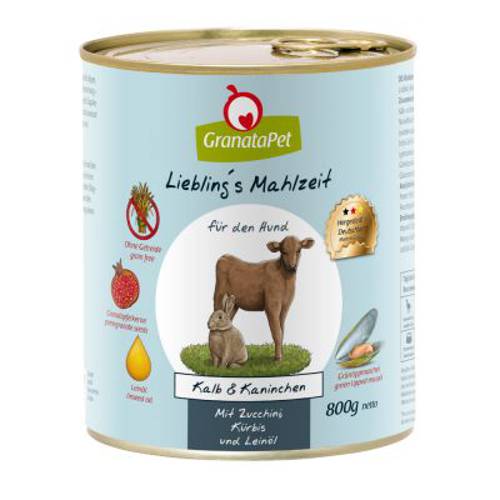 Mhh, szczególnie smaczna i jednocześnie zdrowa – taka jest zbilansowana mokra karma GranataPet Liebling's Mahlzeit dla psów. Karma nie zawiera zbóż, ponieważ psy ciężko je trawią i ich nie przyswajają, co często może prowadzić do alergii.Wysoka zawartość mięsa jest gwarantem, że dostarczymy psu odpowiednią ilość białek, a posiłek będzie dla niego lekkostrawny. Zielona małża zawiera wysoką ilość glukozaminy i chondroityny – dwóch składników, które mogą wspierać proces tworzenie i zdrowego funkcjonowania chrząstek stawowych oraz mocnych kości. Ponadto pokarm bogaty jest w kwasy tłuszczowe omega-3 i omega-6 i zawiera pestki granatu, które mogą mieć trwały, pozytywny wpływ na komórki, tkanki, układ sercowo-naczyniowy oraz mózg i wzrok.