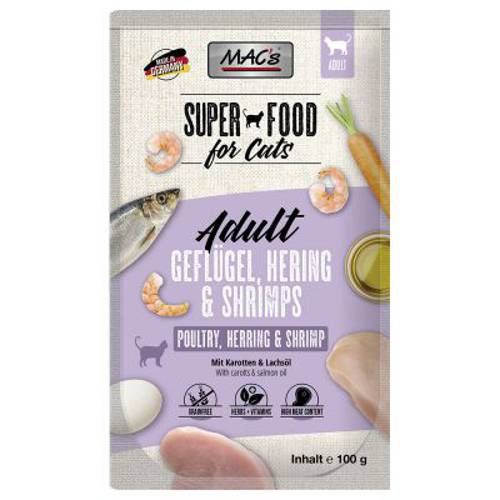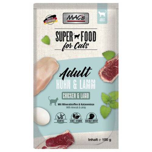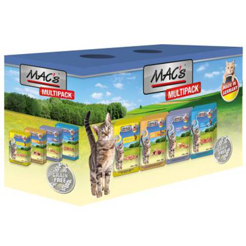 MAC's Cat to wyjątkowo smaczna karma dla kotów, która dzięki specjalnej recepturze zapewnia kotom wyjątkowe przeżycia smakowe. Naturalna dieta kota bazuje głównie na mięsie, dlatego aby zapewnić kotom właściwe odżywianie, karma zawiera 70% mięsa. Kawałki mięsa zanurzone są w pasztecie lub w galarecie, co gwarantuje perfekcyjny smak i wysoką akceptację - pokarm ten zasmakuje nawet wybrednym kotom! Jest to naturalna karma, więc podczas produkcji zrezygnowano z wszelkich konserwantów oraz sztucznych i naturalnych barwników. Zboże, które uchodzi za przyczynę wielu niestrawności i nietolerancji pokarmowych, nie jest zawarte w karmie, dzięki czemu MAC's Cat jest idealna również dla kotów o wrażliwym układzie pokarmowym. Zrezygnowano również z cukru i dodatkowej soli, a zawarta tauryna wspiera wzrok oraz pracę serca. Pakiet mieszany zawiera 4 smaki, dzięki czemu nawet najwybredniejsze koty będa zadowolone z takiej różnorodności. Praktyczne saszetki umożliwiają łatwe porcjowanie karmy oraz zapewniają dłuższą świeżość. Inne ważne witaminy i minerały dopełniają tę karmę, wyprodukowaną w Niemczech.