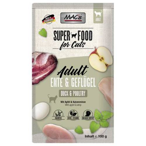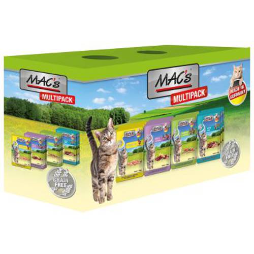 MAC's Cat to wyjątkowo smaczna karma dla kotów, która dzięki specjalnej recepturze zapewnia kotom wyjątkowe przeżycia smakowe. Naturalna dieta kota bazuje głównie na mięsie, dlatego aby zapewnić kotom właściwe odżywianie, karma zawiera 70% mięsa. Kawałki mięsa zanurzone są w pasztecie lub w galarecie, co gwarantuje perfekcyjny smak i wysoką akceptację - pokarm ten zasmakuje nawet wybrednym kotom! Jest to naturalna karma, więc podczas produkcji zrezygnowano z wszelkich konserwantów oraz sztucznych i naturalnych barwników. Zboże, które uchodzi za przyczynę wielu niestrawności i nietolerancji pokarmowych, nie jest zawarte w karmie, dzięki czemu MAC's Cat jest idealna również dla kotów o wrażliwym układzie pokarmowym. Zrezygnowano również z cukru i dodatkowej soli, a zawarta tauryna wspiera wzrok oraz pracę serca. Pakiet mieszany zawiera 4 smaki, dzięki czemu nawet najwybredniejsze koty będa zadowolone z takiej różnorodności. Praktyczne saszetki umożliwiają łatwe porcjowanie karmy oraz zapewniają dłuższą świeżość. Inne ważne witaminy i minerały dopełniają tę karmę, wyprodukowaną w Niemczech.