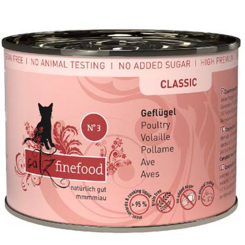 Witalność i zdrowie kota zależy zasadniczo od jedzenia, którym się żywi. Produkty catz finefood to dopasowane do potrzeb, zbilansowane i naturalne karmy dla kotów. Poszczególne receptury są wzorowane na naturalnym pożywieniu, dlatego zawierają najważniejsze substancje odżywcze i białka, które sama natura przewidziała dla kotów. Z tego powodu karma jest wolna od zbóż, będących ciężkostrawnym i nieprzyswajalnym składnikiem w kociej diecie.W karmie znajdują się wyłącznie najwyższej jakości mięso i wnętrzności z niemieckich gospodarstw rolnych oraz ryba z wolnych i zrównoważonych połowów. Cenne, świeże składniki po szczegółowym sprawdzeniu i kontroli weterynaryjnej wejdą w skład catz finefood. Zapewnia to maksymalna kontrola jakości i bezpieczeństwa. Podczas starannego gotowania na parze wszystkie substancje odżywcze oraz cenne kwasy tłuszczowe zostają niemal całkowicie zachowane. Produkcja karmy: wyłącznie w Niemczech.