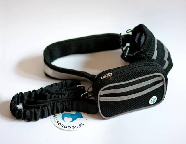 Komplet zawiera pas do biegania, woreczek na przysmaki, saszetka na telefon, portfel czy klucze, rozciąganą smycz 120cm rozciąga się do 180cm