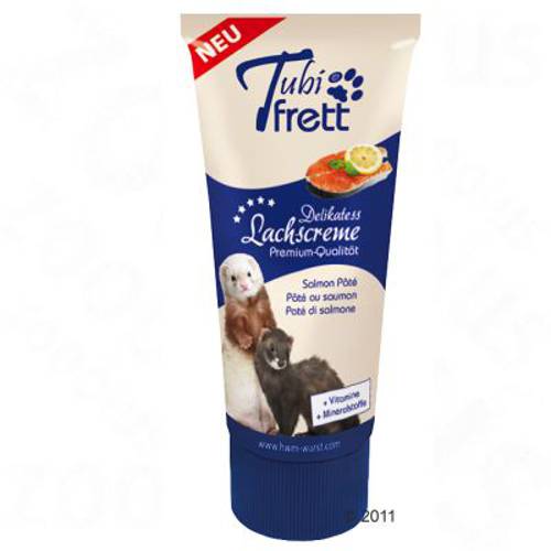 Tubifrett to przysmak dla fretek wysokiej jakości produktów spożywczych. Skład i konsystencja zostały idealnie dopasowane do potrzeb fretek. Świeży łosoś zostal przerobiony na łatwą w dozowaniu pastę i wzbogacony o cenną dla fretek taurynę i witaminy. Pasta nadaje się idalnie jako karma uzupełniająca do optymalizacji codziennego zapotrzebowania na witaminy i zapobiegania niedoboru tauryny u fretek. Jest wolna od sztucznych konserwantów i barwników, ulepszaczy smaku i cukru. Poprzez wysoką zawartość ryby jest bogata w nienasycone kwasy tłuszczowe, które zapewniają błyszczącą sierść.Forma pasty sprawia, że przysmak jest łatwy w dozowaniu, ma wysoką akceptację i pomaga w wychowaniu fretek. W ten sposób pobyt u weterynarza lub pielęgnacja sierści staną się dziecinnie proste.