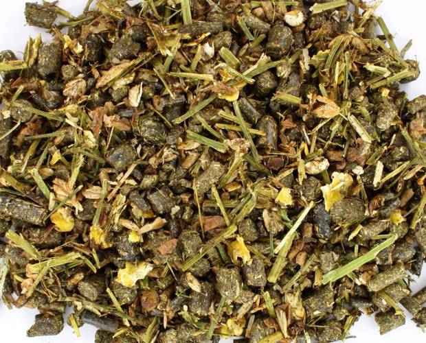 Skład paszy: tymotka, lucerna, miazga z nasion słonecznika, lucerna, łuska słonecznika, jęczmień, pulpa z jabłek, olej lniany, pulpa z cykorii, płatki jęczmienne, płatki z kukurydzy, płatki orkiszowe, melasa z trzciny cukrowej, węglan wapnia, monofosforan wapnia, olej słonecznikowy, olej lniany, chlorek sodu, magnez oksydowany.