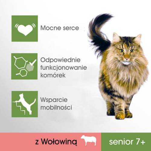 Kompletna karma sucha dla starszych kotów (>7 roku życia), z wołowiną, formuła „Total 5“ dla witalnego życia, z tauryną, glukozaminą i kwasami tłuszczowymi omega-3, dla wsparcia pracy serca i stawów