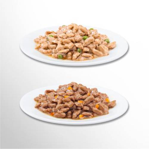 - Wołowina z marchwią i kurczak z grochem w sosie.